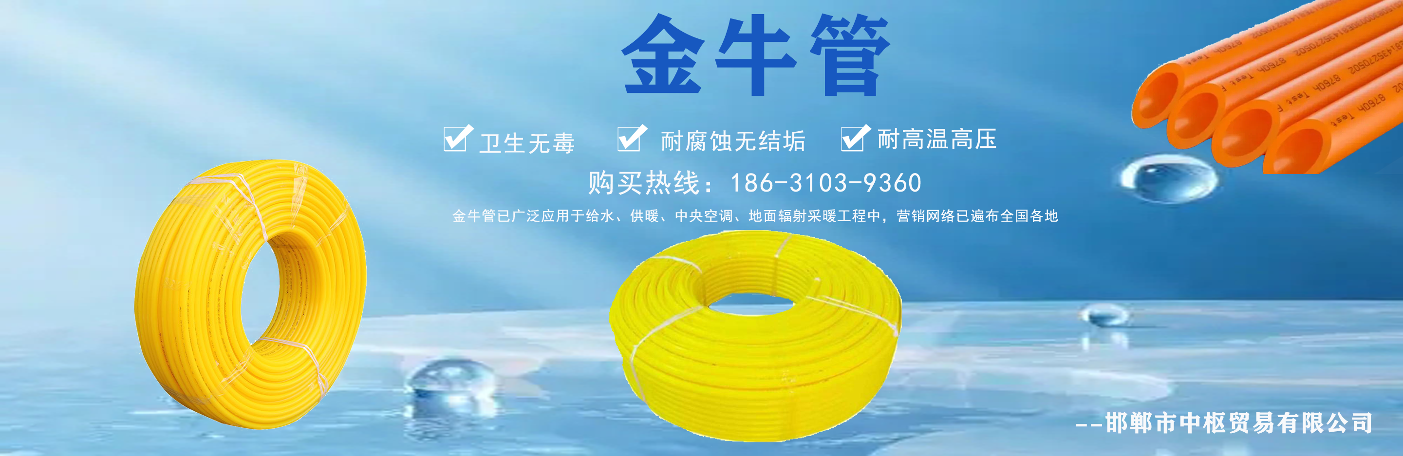 邯鄲市中樞貿易有限公司主營日豐管,日豐管代理,日豐管廠家批發,金牛管,金牛管代理,金牛管廠家批發等,質量可靠,值得信賴!  我公司在產品行業積累了豐富的經驗,具有嚴格的管理制度,同時引進先進的生產設備和生產技術,一如既往的為廣大客戶提供質優價廉的產品。創辦多年來在市場上贏得較好的口碑,銷售網絡覆蓋全國各個省市及地區?! ≠|量為先,信譽為重,管理為本,服務為誠,我們將致力于這一經營理念,關注時代發展,用先進的技術,不斷創新求實,以更優的質量,更好的服務來滿足我們的廣大客戶。  公司理念:勇于進取、開拓創...